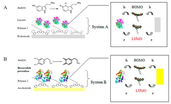 Scheme of (A) measuring system A: Pt-E/bisEDOTDTSi/Lac and (B) system B: Au-E/bisSeDTSi/Pox. HOMO: highest occupied molecular orbital, LUMO: lowest unoccupied molecular orbital.