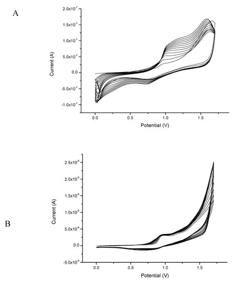 In this study, the electrochemical synthesis of the polymers occurs via electrochemical oxidation (anode process) using cyclic voltammetry. This process takes place in three stages: oxidation of the monomer on the electrode surface with the formation of soluble oligomers in the diffusion layer, polymer settling on the electrode surface combined with the nucleation and chain-growth process, and further polymerization of the layer deposited on the electrode resulting in the formation of longer chains and crosslinked products [].