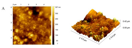 In order to visualize the topography of the surface and to determine the polymer films’ structure, atomic force microscopy (AFM) measurements were performed using a Bruker MultiMode V microscope (Labsoft, Warsaw, Poland). The measurements were performed in tapping mode in air-ambient conditions (25 °C and 35% relative humidity) and at a scanning speed of 3 μm/s. The standard etched rotated silicon tips were used with a tip radius <10 nm and nominal resonance frequency of 300 kHz for the cutting edge.