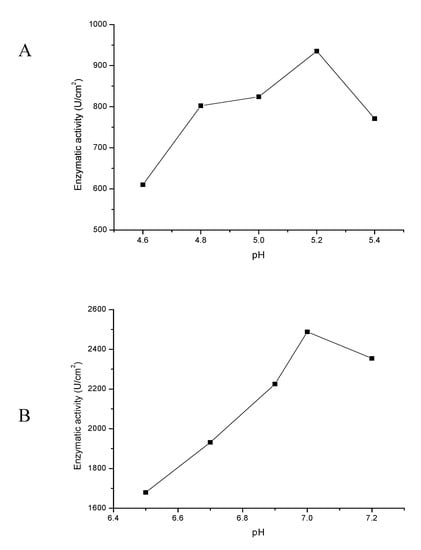 Activity of the immobilized laccase (A) and horseradish peroxidase (B) at various pH levels.