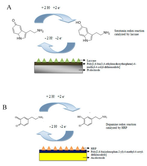 In this paper, we present a novel semiconducting polymer-based electrochemical biosensor for dopamine and serotonin detection. The method described here was based on original polymers, which acted as a matrix for enzyme immobilization (stable matrix for a protein anchoring, which also ensured stability during measurements), detection based on an enzyme-dependent redox reaction and electrochemical measurements, and presented a highly sensitive, quick, and simple analytical procedure. However, the main advantage over the other systems known from the literature is the low detection limit in comparison with other systems [,,] and excellent selectivity. The fabricated gold and platinum electrodes modified with semiconducting polymers (poly[2,6-bis(3,4-ethylenedioxythiophene)-4-methyl-4-octyl-dithienosilole], poly[2,6-bis(selenophen-2-yl)-4-methyl-4-octyl-dithienosilole)]), and laccase or horseradish peroxidase (HRP) exhibited exquisite electrochemical behavior and direct electron transfer was achieved. As described in this work, bio-platforms for selective and sensitive neurotransmitter determination directly contribute toward improving quality of life, which is a key priority for global scientific ventures.