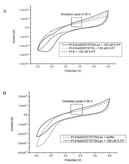 Figure 9A shows the CV voltammograms obtained for a bare Pt electrode, Pt electrode modified with bisEDOTDTSi, and the Pt-E/bisEDOTDTSi/Lac complex, recorded in the presence of 100 μM 5-HT. Differential pulse voltammetry (DPV) was a more accurate method for determining the specific analytes in comparison with the CV method, where the low sensitivity makes CV inapplicable for quantitative analysis. However, due to serotonin being quite difficult to measure, it was decided to use the CV technique. The oxidation peak of serotonin at the bare Pt electrode was broad and weak, which associated with very slow electron transfer. An increased peak was visible for the modified polymer electrode; however, as it can be observed, the signal from the oxidation peak was the highest in the presence of laccase, which proves that using the protein in the modified electrode significantly improved the performance of the bioreceptor part. Moreover, the peak potential was shifted to a less positive value (3.7 V), which is characteristic for 5-HT determination (around 3.76 V []). Furthermore, an additional measurement for presenting the enzymatic activity of the laccase immobilized on the modified electrode was executed, which was Pt-E/bisEDOTDTSi/Lac only in the presence of a phosphate-citrate buffer (Figure 9B). As shown, buffer did not provide any oxidation peak, with the signal coming directly from the 5-HT.