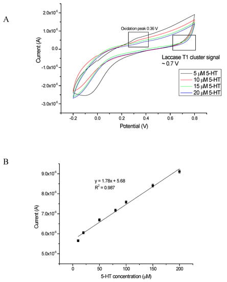 The direct electron transfer to the T1 Cu of laccase takes place at the usual high potential over 0.6 V versus Ag/AgCl []. In accordance with the above-described facts, an oxidation mechanism of serotonin catalyzed by laccase was proposed. As it can been observed in Figure 10A, the specific signal of redox of the T1 cluster of laccase was present, as well as an oxidation peak from serotonin (Supplementary Materials; Figure S1A,B, available online).