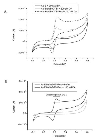 Moreover, to register the enzymatic activity of the horseradish peroxidase immobilized on the modified Au electrode, additional measurement were made using the detection system (Au-E/bisSeDTSi/Pox) without DA in the investigated sample, only in the presence of a PBS buffer (Figure 11B). As demonstrated, the PBS buffer did not influence to the measurements, and the oxidation peak was only found for DA.