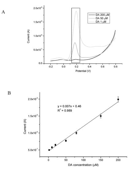 (A) Representative differential pulse voltammetry (DPV) scans for increasing DA concentrations (1, 50, and 200 μM), and (B) relationship between the DA concentration and current (biosensor response).