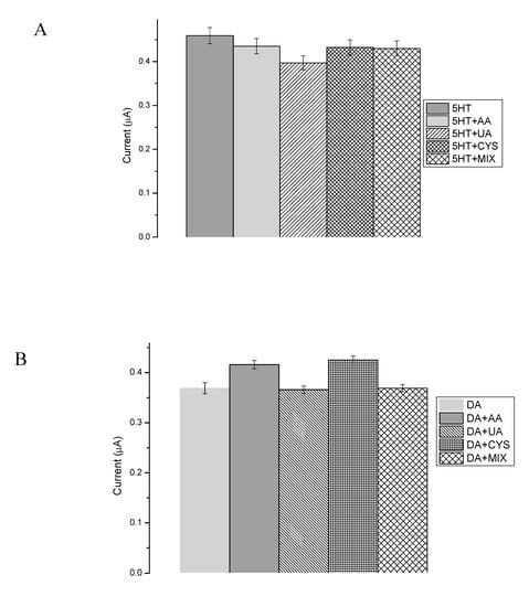 As it can be observed in the CV results in Figure 9A,B, an electrochemical determination of 5-HT levels is very complicated (weak visibility of 5-HT oxidation peak) because of high sensitivity to other electroactive biomolecules, which can interfere with 5-HT; furthermore, the oxidation products of serotonin can absorb onto the surface of electrode, which disrupts the measurement, and may influence the oxidation peak []. Due to this, it was decided to provide only the CV measurements, which gave better signals and showed the whole electrochemical process. Additionally, it allowed for the use of a bare electrode for the determination of serotonin results at a low sensitivity and selectivity due to the above reasons. To resolve these problems, the most effective approach was to choose conductive and selective materials for the modification of the working electrode to improve the measuring sensitivity and selectivity toward 5-HT.