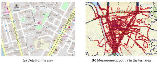 The chosen test area has a high density of Wi-Fi measurements and allows for long-term variations in Wi-Fi signal propagation. The area is characteristic to the urban environment of Romania, being placed between two high-traffic boulevards while the buildings in the area are tower apartment blocks. Locations of measurements in the test area are shown in Figure 1b.