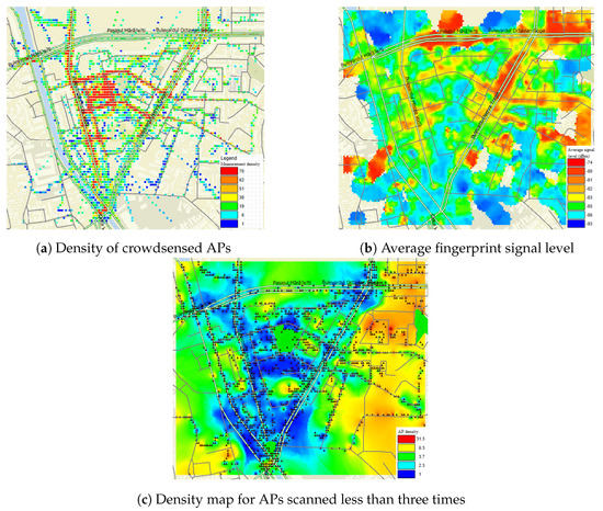 Figure 3c was obtained by plotting the density of APs scanned less than three times. By comparing Figure 3a,c we observe that APs scanned less than three times were observed at the margins of the test area where the overall density of measurements was lower. This leads to the following observations: