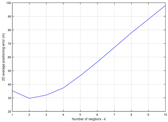 The analysis of the influence of the number of neighbors on the accuracy of the positioning was done by varying the number between 1 and 10 and by computing the average 2D positioning error in each scenario. The dataset used contains 15,002 fingerprints of 1929 APs in the test area with an average estimated radius between 0 and 30 m. The results are displayed in Figure 4.