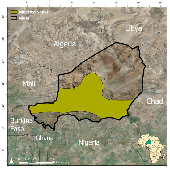 Niger is a large landlocked country in west Africa, bordered by Mali and Burkina Faso to the west, Algeria and Libya to the north, Chad to the east, and Nigeria and Benin to the south (Figure 1). The study area is the Tahoua Region of Niger (Figure 2), which is located in the southwest of Niger and is crosscut by the Sahel, a large ecoregion that spans across Africa and is characterized by a semi-arid climate with seasonal vegetation and water bodies that are driven by a mono-modal pattern of annual precipitation that typically peaks in August. Annual precipitation in the Tahoua Region varies from north to south, with areas in the north receiving as little as 200 mm per year and areas in the southern portion of the Sahel receiving as much as 600 mm per year [28]. This pattern of precipitation is one of the main drivers of the filling and drying up of surface water bodies in the region. Vegetation also varies on this north-to-south axis, with small scale cultivation in the south and dry steppe in the north. The Tahoua Region on Niger is an important area for migrating pastoralists [1,2,4] who rely on dispersed water bodies for hydration throughout their journey.