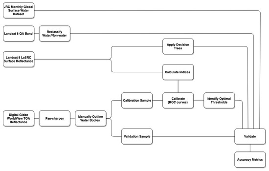 Flowchart of methods. Input datasets include the Joint Research Center (JRC) monthly global surface water dataset, Landsat 8 surface reflectance and QA band, and DigitalGlobe WorldView imagery.