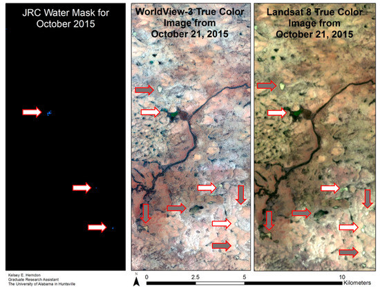 Both the JRC GSW and Landsat QA datasets practically eliminate false positive (FP) water identifications (Table 4). However, in doing so they underestimate the extent of surface water for the study area. For October 2015, the JRC GSW dataset had an OA of 0.84, with an FP rate of less than one percent but a false negative (FN) rate of 0.15. The Landsat QA water masks demonstrated similar results to the JRC GSW dataset, with OA ranging from 0.77 to 0.93, FP rate ranging from 0 to less than one percent, and the FN rate ranging from 0.02 to 0.22. The FN points for both global surface water datasets primarily consisted of water bodies that were small and turbid, as identified visually in the DG higher resolution imagery. The spectral signature of these water bodies can appear similar to certain soils and exposed rock, which may lead to misclassification if they are not included in the training dataset. Figure 4 illustrates underestimation of surface water extent provided by the JRC monthly surface water dataset compared to the reference dataset for the same month.