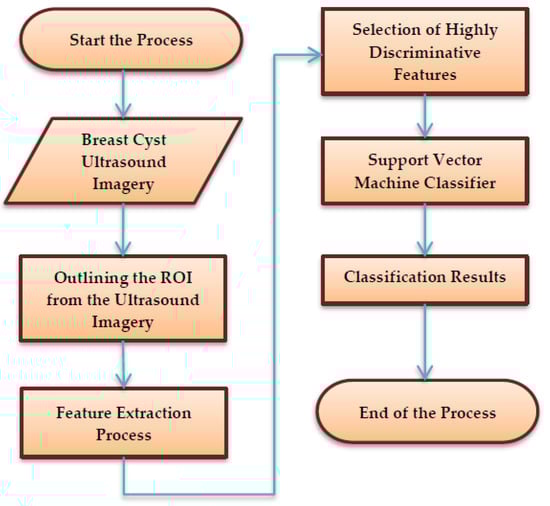 The schematic process flow diagram of the SVM-enabled intelligent genetic algorithmic model is depicted in Figure 1. Primarily, the process begins with marking and segregating the ROI from the breast cyst ultrasound imagery by a medical practitioner based on his expertise, along with insights from the biopsy report. Then, it is followed by the extraction of 126 unique sets of features from the marked ROI ultrasound imagery utilizing a mask with a size of 23 × 23. Subsequently, the highly discriminative features that exhibit superior accuracy in classifying the images are chosen by deploying the intelligent genetic algorithmic approach. In the final step, the breast cyst ultrasound imagery is classified as breast mice and invasive ductal carcinoma with the assistance of a support vector machine (SVM) approach.