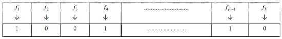 In the design of chromosomes, each chromosome can be portrayed utilizing an n-digit binary string. Further, the factor “F” signifies the total number of feature sets. Moreover, individual chromosomes designate either the digit “one” or “zero” to indicate the selection of a feature. The schematic diagram of the binary encoding of the chromosome is depicted in Figure 3.