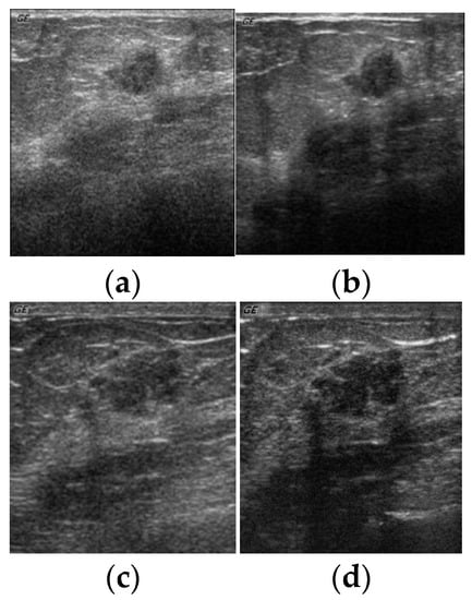 Ultrasound breast cyst image for four distinct settings of the parameters acquired from the same ultrasound sensing system (GELOGIQ 700). Breast cyst images acquired from (a) Parameter Setting-1, (b) Parameter Setting-2, (c) Parameter Setting-3, and (d) Parameter Setting-4.