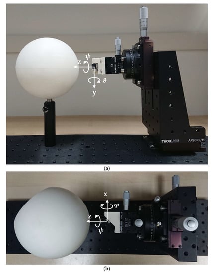 The conceptual design of the horizon sensor was verified through a five degrees-of-freedom experimental testbed designed and assembled in our laboratory, making use of opto-mechanics components from Thorlabs Inc. (see Figure 4). The testbed was equipped with one camera and implements a virtual multi-head sensor, which is described in the following. Indeed, using a single camera with variable orientation allowed for a simpler and more cost-effective implementation of the testbed than by using three separated physical cameras, without undermining the algorithm validation. The sensor employed consists of a Flir Lepton® 3 camera (see Table 2), thus representative of a lower resolution sensor implementation targeted to nano-satellites. Three rotational degrees of freedom are provided by micrometric stages, having 10 arcmin of resolution. The target consists of a spheroid made of PVC plastic having nominal radii equal to 68.75 and 69.00 mm, respectively and mounted with the axis of symmetry orthogonal to the test-bed plane. The remaining two translational degrees of freedom allows for fine alignment between the camera and the target center. Rotations are implemented as a 3-1-2 (yaw-roll-pitch) rotation sequence, with angular excursions of 360° about yaw (ψ), ±5° and ±10° for the roll (φ, inner) and pitch (ϑ, outer) axes. Yaw axis is directed towards the spheroid center, pitch axis is orthogonal to the test-bed plane (positive downward), and roll axis directed to create a right-handed triad. The camera itself is then mounted on a PVC support tilted by 45° about pitch axis, for having a portion of the spheroid limb in view at nominal orientation.