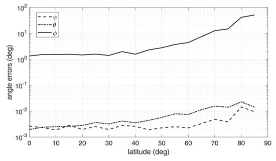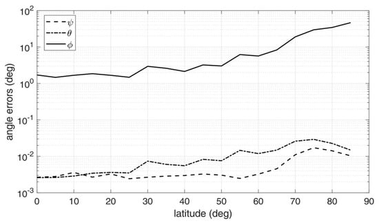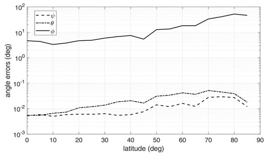 Attitude errors as a function of latitude for an Earth-like spheroid with atmosphere, h/RE = 0.3 [].