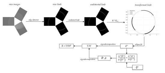 Equation (6) is a modified form of the well-known orthogonal Procrustes problem, and is also known as the hand-eye calibration problem []. Now, assume that we do not wish the overall target size to be known, rather only the semi-axes ratios. We define a dimensionless matrix :