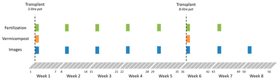 The experiment was designed as randomized blocks, with four treatments to be applied to four groups of plants (T0, T1, T2 and T3). The trial design is described by Figure 2, which shows the specific moments when the treatments were applied, and the multispectral images were acquired. The fertilizations were carried out weekly using water-soluble organic fertilizer (3% of Nitrogen and 5% of potassium) obtained from beet vinasse and phosphorite, and registered for use in organic production (COMPO-Fertilizante Huerto y Frutales). The initial volume of irrigation and fertilization was 300 mL of solution. One week after transplant, plants were assigned to the different treatments according to the fertilizer label (T0: 0 mL, T1: 6.25 mL, T2: 12.5 mL and T3: 25 mL, which corresponds to T0: 0 g of N and 0 g of K, T1: 0.15 g of N and 0.30 g of K, T2: 0.30 g of N and 0.60 g of K, T3: 0.60 g of N, 1.20 g of K). The plants also received two supplements of vermicomposting: one in the first transplant (T0: 0 mL; T1: 75 mL; T2: 150 mL; T3: 300 mL) and another after the second transplant (T0: 0 mL; T1: 237.5 mL; T2: 475 mL; T3: 950 mL). Images of the plants were acquired with 7-days intervals and processed to compute vegetation indices and analyze them.