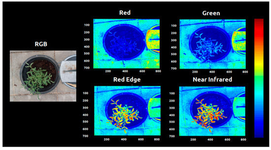 The camera used for image acquisition was a multispectral camera (model Sequoia, Parrot Drones, Paris, France, 2017) which was originally designed for use in agricultural Unmanned Aerial Vehicles (UAV’s). Its internal sensor is composed of four spectral bands which register the reflected light coming from the vegetation and can be used to distinguish plant vigor based on reflectance levels [34]. These bands are: green (550 nm wavelength, 40 nm bandwidth), red (660 nm wavelength, 40 nm bandwidth), red edge (735 nm wavelength, 10 nm bandwidth) and near infrared (790 nm wavelength, 40 nm bandwidth). Additionally, a 16-megapixel RGB camera is also fitted into the commercial system.