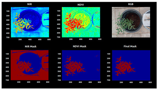 Plant segmentation is the cornerstone of the image analysis at plant level. Diverse authors used multispectral images to access the nutritional level of the plants. These works are usually focused in small zones or areas, or in multiple plants in a parcel as the minimum management unit. In order to perform precise fertilization at the plant level, the segmentation and extraction of the plant of interest must be also precise. The algorithm developed using the normalized difference index was able to distinguish plant tissue from soil, pot, floor and metal platform extracting the whole plant apart of the background (Figure 4, Figure 5 and Figure 6). The use of NDVI for vegetation extraction and monitoring is widely used for satellite imagery [47,48,49] and this study proves that can also be used with high-resolution plant images. The code was applied in different conditions with good efficacy in extract the plant. The visual inspection was needed to guarantee that the plants were well-segmented and also provides the distribution of the vegetation indices intensity through the leaf tissue. The segmentation also allows morphological analysis during the time, and this system can be useful for digital phenotyping projects. However, the code can present limitations for morphological analysis of plants with presence of senescent leaves since the reflectance of yellow and/or brown leaves are different from the active vegetative tissue.
