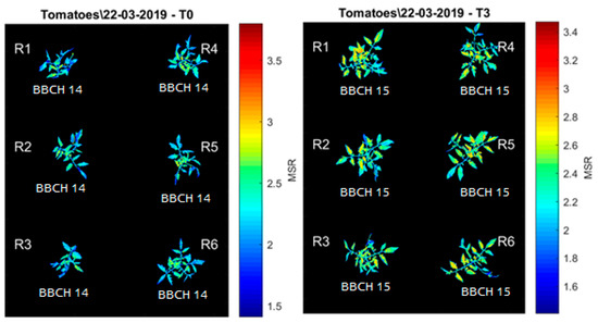 Example of vegetation indices obtained through the Parrot Sequoia camera and segmentation algorithm. Modified Simple Ratio (MSR) image and phenological state (BBCH scale) of the T0 treatment (left) and the T3 treatment (right).