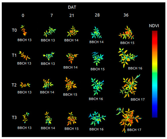 The images were taken in the same position during the weeks in order to observe the growth behavior of the plants in the different treatments. Both aspects could be observed during this time: morphological traits and vegetation indices (Figure 8).