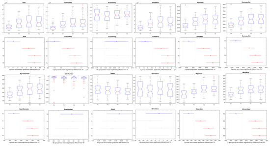 Functional boxplots showing morphological responses extracted from multispectral images correlating with number of weeks after transplant and fertilization treatments with a confidence interval of 95%. T0, T1, T2, and T3 were the four groups of plants treated with different amounts of fertilizer and vermicompost (see Section 2).