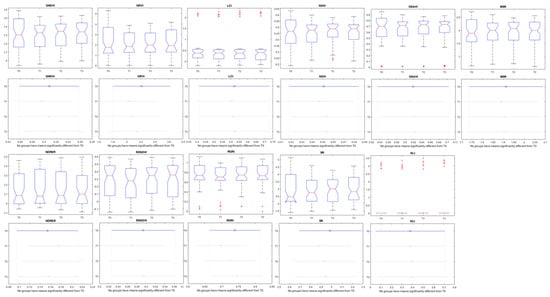The graphical representation of the boxplots and Tukey’s comparison test can be seen in Figure 9. In the case of the morphological aspects, some of the parameters presented significant results with distinction between the control (T0) and the treatments (T1, T2, and T3) (Figure 9). On the other hand, none of the vegetation indices presented a significative difference (with a 99% or 95% level of confidence) to predict the nutritional level of organic tomato plants independent of the week after transplant (Figure 10).