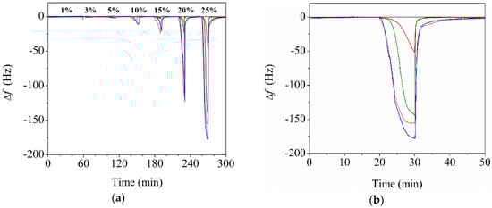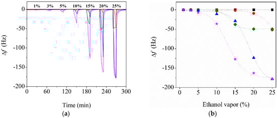 Figure 4a shows the changes in the resonance frequencies (i.e., changes in the modulus) of the bare QTF, P30-QTF, and CP30-QTFs with different amounts of CNCs in PMMA (0.5 wt%, 0.5CP30-QTF; 1.0 wt%, 1CP30-QTF; and 3.0 wt%, 3CP30-QTF) when exposed to ethanol vapor. Ethanol vapor was injected into the flow cell for 10 min to allow for the adsorption of ethanol vapor, and dry nitrogen was then injected for 30 min to remove the ethanol vapor. The frequency decreased during the adsorption of ethanol vapor and the frequency change increased as the ethanol vapor concentration increased. The frequencies recovered to their original values after the removal of ethanol vapor, confirming that ethanol adsorption on the electrospun fibers is reversible.
