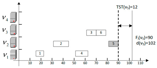 The fog servers are sorted in Algorithm 2, the fog servers are swapped at least M × log(M) times. Besides, the traverse of the sorted fog servers consumes M times, therefore, the time complexity of Algorithm 2 is O(M × log(M)). The most cost-efficient unoccupied fog server is acquired in while satisfying the deadline of the task . The task scheduling rule is compared to obtain the fog server with minimum cost for the task . This mechanism guarantees that the finish time of task is equal with or smaller than the deadline . For tasks with smaller than , in most circumstances, generally, the result of the TST, , is the difference between and . Figure 3 illustrates an example of the task with . To fully exploit TST, next task starts to execute as the first finish method is proposed to reclaim the TST. Supposedly, the study has many tasks which are indifferent workloads and deadlines. Every task has a different slack time. So the study has proposed an algorithm like that, when a task is finished in execution then server starts to execute the next task. The selection of a right fog server to execute tasks while minimizing cost optimization is very critical. If we do not find the right fog server for an assigned task then it would consume more cost and resources. Hence, the study needs to schedule all tasks on a variety of fog servers in a cost-efficient way. Figure 4 shows the difference between random fog server searching and cost-efficient fog server searching. The author could see the difference between both methods—which is more cost-efficient and meets the user-defined deadline. In this example of the figure, the study has six tasks that have different workloads ready for execution over four fog servers. All the fog servers are heterogeneous and have different processing capacities. So these six tasks are going to be scheduled over these four fog servers with the lowest cost. First, in the random fog server searching method, the author could see the six tasks take all four fog servers for their execution. In addition, some tasks have finish times exceeding the defined deadline and some resources are wasted. But in the second cost efficient fog server searching method, the author could see it took just three fog servers to execute all the tasks and all the tasks were finished within their deadlines while minimizing unit cost of fog servers. This means that the right fog server for scheduling a task is very helpful in reducing computation resource costs.