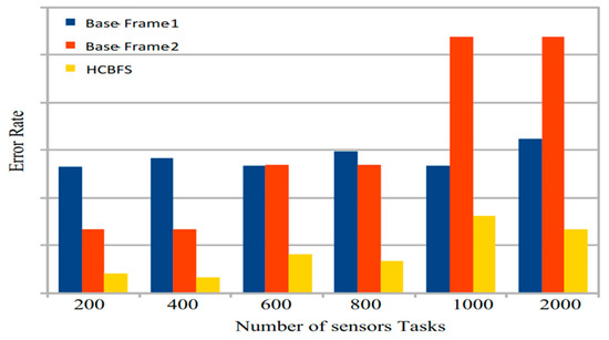 The healthcare based fog cloud system (HCBFS) is a cost-efficient system that ensures the task quality of experiment (QoE) of different tasks during assigning and processing in the heterogeneous fog server environment. The management of real-time generated data by different sensors and the stochastical arrival of tasks to the system is not easy. Therefore, the study estimated each task execution time, then prioritized them and performed initial scheduling without any delay. After that, the fuzzy-based efficient algorithm reschedules all tasks with minimum cost under their deadline requirements. Figure 6 illustrates that the HCBFS has a lower error rate (i.e., failure ratio of tasks) during offloading and scheduling on different heterogeneous fog servers. The current study did not focus on error ratea and the QoE of tasks, it only considered the scheduling situation without any deadline constraint. The study’s proposed framework adopts any environmental changes during the schedule, and reduces the applications and improves the overall performance as compared to the current static fog cloud architectures.