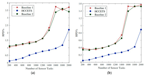 CPU utilization of fog servers. (a,b) the HCCETS incurs lower RPD% in terms of CPU utilization as compared to the existing Baseline 1 and Baseline 2.