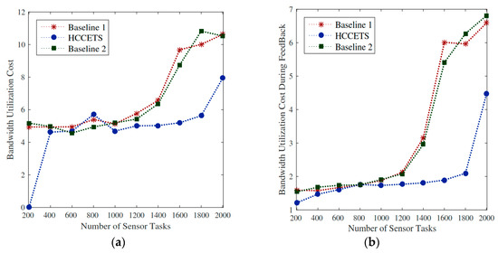 As the study suggests, the system schedules N numbers with deadlines into heterogeneous fog servers. It is significant to allocate critical healthcare tasks in a certain way that must execute in their deadlines. In this system, we have abandon computing resources to schedule requested under their deadlines. Generally, tasks miss their deadlines due to resource-constrained issues in the servers. Therefore, the author takes different fog servers with distinctive capacities to avoid any failure of job. This study sets the sum of deadlines for completing tasks under 2.5 points. Figure 7 shows the relative percentage ratio of the objective function while considering that the deadline metric lower while exploiting the proposed HCCETS framework. The main reason behind this is that Baseline 1 and baseline operated homogeneous fog cloud servers with limited resource capabilities often suffer from many failures of tasks during scheduling. Figure 7a,b proves that the RPD% of the objective is improved by exploiting HCCETS as compared to the existing baseline approaches. The main cause is that the existing baseline heuristics approach do not considered the rescheduling situations when they make task assignments to the heterogeneous clouds, whereas Figure 8, Figure 9, Figure 10 and Figure 11 show that HCCETS also reduces the cost of bandwidth utilization cost, CPU utilization cost, and task scheduling for all requested tasks.