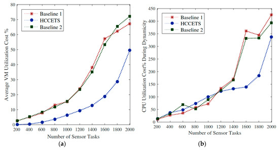 IoMT applications consist of different kinds of tasks such as critical tasks and non-critical tasks. Risky jobs require immediate resources for execution. Generally, this process is costly and incurs extra cost during scheduling in the system. However, non-critical tasks may be scheduled into a tawdry fog cloud server because they have deadlines for their executions. The proposed HCCETS schedules critical functions to the high-performance fog servers (expensive cost), and non-critical tasks to the cheap fog servers; in this way, the author can maintain the overall cost of the applications. Figure 9a demonstrates that the HCCETS incurs lower RPD% in terms of CPU utilization as compared to the existing Baseline 1 and Baseline 2. Where existing studies exploited homogeneous fog cloud systems with steep costs, and scheduled all tasks on the same type of servers, it incurred unreasonable costs during scheduling. We considered the dynamic environment of network contents to the recognized problem, and it can be seen that Figure 9b HCCETS is an adaptive method during runtime changes in the system that doesn’t affect application performance.