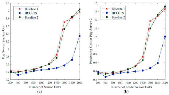 Initially, this study scheduled all tasks based on available resources in the fog server environment under their deadline requirements. There is no wait time for each job in the system, because all tasks are scheduled immediately into heterogeneous fog clouds while satisfying their deadlines. As the author assumed to abandon resources regardless of servers, Figure 10a shows that HCCETS improved system utilization cost as compared to the homogeneous system based Baseline 1 and Baseline 2. The main limitation of the [40,41] homogenous system is that they have resource constraints and non-allocated tasks must wait until resources become free after some time. The swapping between high-cost fog server1 to low fog server 2 is quite useful once the scheduler does the initial schedule. HCCETS reshuffled tasks placement between fog servers to minimize the system cost, as shown in Figure 10b.