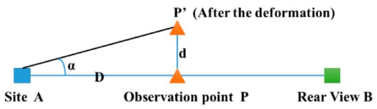 The traditional observation method is to accurately measure the small angle and the distance between the set station and the observation point using the total station. The principle of observation is shown in Figure 2 where A and B are reference points. The total station is located at point A, and the prism is located at point B. P is the monitoring point, and P’ is the monitoring point after deformation. The angle from total station to the monitoring point is α.