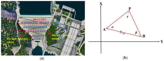 During this study, an improved method based on total station was adopted—the angle forward intersection method. The schematic diagram for this method is shown in Figure 3a,b.