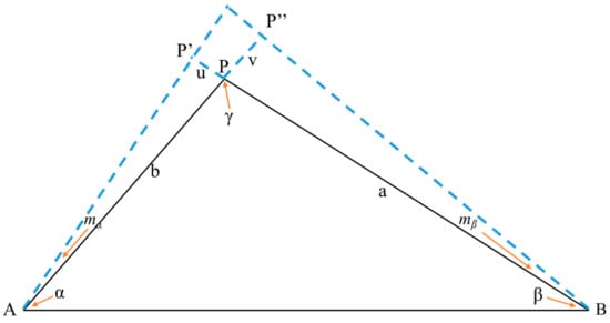 The accuracy of the angle forward intersection method is derived in detail below based on Figure 4. A and B are selected points, and the distance between them is . and are observation angles, is the intersection angle, and P is the observation point. and are the observation errors of and , respectively. When there is no error in angle , the error of angle will cause the displacement of point P in the direction of BP to be u (PP′). When there is no error in angle , the error of angle will cause the displacement of point P in the direction of AP to be v (PP″).