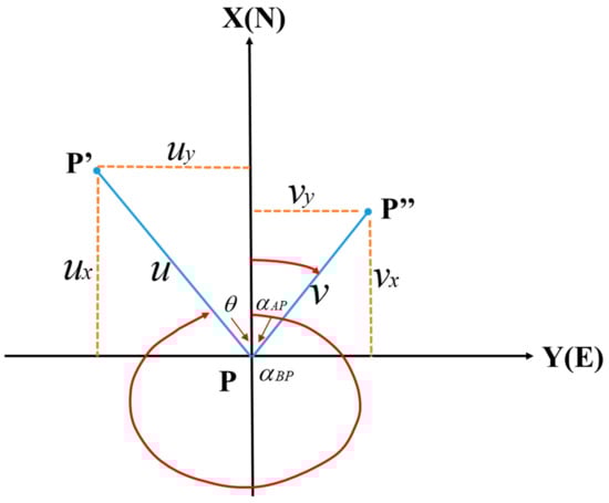 Generally, and are observed with equal precision and, thus, we assume that . The x- and y-components of and are shown in Figure 5. A rectangular coordinate system is established with P as the origin. The components of u and v on the X- and Y-axes of the coordinate system are , , and , and the coordinate azimuths are αBP and αAP.