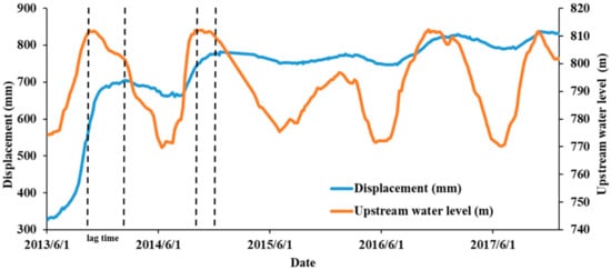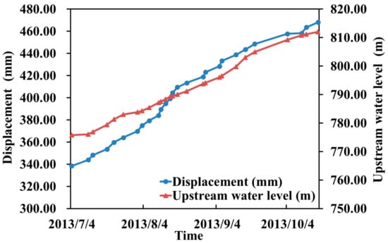 We further analyzed the data and compared the relationship between the changes of the upstream water level and the displacement, and the changes are plotted in Figure 9.