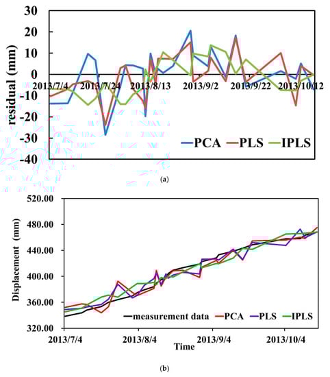 Meanwhile, combined with the measured data, the displacement calculated using the PCA, PLS, and IPLS methods and the measured data are shown in Figure 10b.
