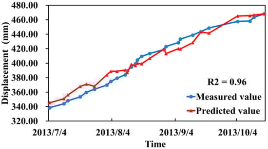 The goodness of fit was used to measure the quality of the fit []. The independent variable factor data were substituted into Equation (17), the predicted value and goodness of fit of the displacement were calculated, and the time series process lines of the measured and predicted values are shown in Figure 11. Meanwhile, the goodness of fit is evaluated with the p values. We use the Statistical Product and Service Solutions (SPSS) tools to calculate p values for PCA, PLS and IPLS. We found that p value for IPLS is 0.543, less than the p value of PCA (0.715) and PLS (0.625). The estimate of the goodness of fit (GoF) is significant.
