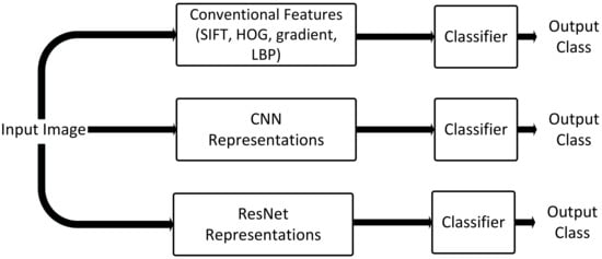 For feature extraction, we used a pre-trained ResNet-50 [] deep network architecture in our experiments. We used the publicly available model of this network, which was pre-trained on the ImageNet dataset. We implemented our proposed method using MatConvNet [] and the SVM classifier using LIBLINEAR [] (Figure 2).