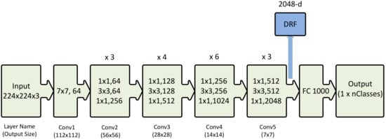 ResNet-50 architecture [] shown with the residual units, the size of the filters and the outputs of each convolutional layer. DRF extracted from the last convolutional layer of this network is also shown. Key: The notation k × k, n in the convolutional layer block denotes a filter of size k and n channels. FC 1000 denotes the fully connected layer with 1000 neurons. The number on the top of the convolutional layer block represents the repetition of each unit. nClasses represents the number of output classes.