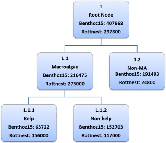 We have used the local binary classification technique in this paper to identify kelps from other taxa. This approach is easier to implement and more useful when all the nodes in the hierarchy are not labeled to a specific leaf node level. For example, some macroalgae are not labeled to the species level in the Benthoz15 dataset []. Moreover, this approach also allows for the use of different features, training sets and classifiers for each node of the hierarchy tree. The hierarchy tree for kelps is shown in Figure 4.