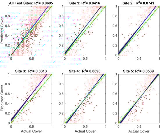 The first sub-plot in Figure 5 shows kelp coverage for all of the data included in the test set. The slope of the line generated by linear regression is very close to the ideal case. This highlights the robustness of our proposed algorithm. The remaining sub-plots show kelp coverage for each of the five sites. These sub-plots show a good agreement between the annotations generated by our proposed method and the annotations provided by the human experts (Table 6). Moreover, we also calculated the R-squared () value for each plot to show correlation between the actual and predicted cover. Our proposed method achieved a high value for each individual site and then all sites combined. It is important to note that the DRF classification seems to over-fit kelp cover at high percentages of cover and to under-fit kelp cover at lower ones.