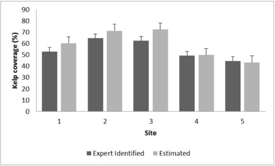 The estimated kelp coverage is not significantly different from the coverage calculated by the experts from the ground truth labels (Figure 6). This indicates the robustness of our proposed method for estimating kelp coverage. These results are beneficial to marine scientists since many surveys focus on estimating kelp coverage, which is an important metric to indicate the health of kelp forests.