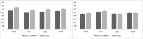 Figure 7 shows the expert identified and estimated percent cover of kelp across years of sites 2 and 4. For site 2, a slight over estimation of kelp cover by the DRF classification is visible, however no distinct trend of change across years is observable in either manual or automatic classification. On the other hand, the estimation of kelp cover for site 4 shows no overestimation and similarly to site 2, no trend change in kelp cover over the years.