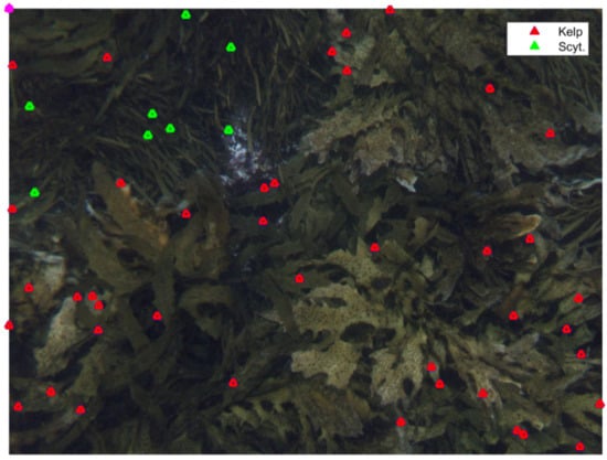The rapid characterization of ecological changes is crucial in light of the catastrophic threats to marine biodiversity posed by the rise of extreme climatic events driven by climate change and other anthropogenic stressors. Technology has enabled the rapid collection of images even in remote locations through autonomous underwater vehicles, remotely operated vehicles, automated cameras and even satellite imagery. The subsequent annotation of such imagery is typically time consuming and consequently, the automation of marine species classification from digital images has become a priority. This study focuses on the kelp species E. radiata, which is the dominant habitat builder of temperate reefs in Australia, though automated classification of marine species was applied to other important marine species. For example, progress in automated tropical coral identification has resulted in accurate classification the level of genera []. Other successful automated classification techniques for coral reefs include the collection of multifaceted data, minimum manual classification effort (around 2% of pixels) and machine learning techniques which result in cm-scale benthic habitat maps of high taxonomic resolution and accuracy of up to 97% []. Similarly, in pelagic species such as fish automated classification has advanced rapidly, with automated fish detection and identification algorithms also measuring basic fish morphological features such as total length [,]. In contrast, automated methods for identification of marine macroalgae from benthic images still result in low agreement [], highlighting the need for more research into unequivocal definitions of algal groups for image classification.